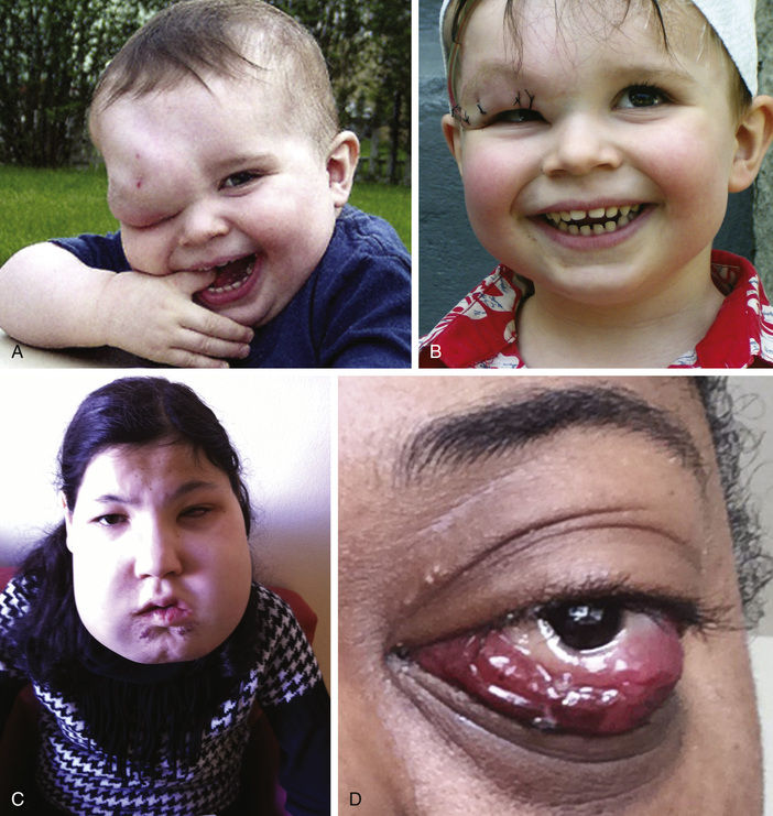 The natural history of LMs is as variable and unpredictable as the many forms they may take involving the orbit. Pan-facial and hemifacial lesions may be associated with orbital components, whereas other lesions may involve only the eyelid or conjunctiva in isolation (Fig. 24.8). Particularly in the orbit, danger arises mostly because of acute increase of size of the lesion after bleeding or upper respiratory infection. Other complications include intermittent swelling, blepharoptosis, amblyopia, chemosis, globe displacement, optic neuropathy, exposure keratopathy, astigmatism, and strabismus.14,37 Even without rapid enlargement, LMs may cause bone remodeling and produce skeletal hypertrophy, with protrusion of the zygoma and/or frontal bone. Gradual expansion often leads to progressive proptosis and slow decline in vision.1,14 Some cases may, however, show little progression, particularly when treated early and thoroughly. When a surgical approach is indicated, prognosis is excellent with complete resection.32